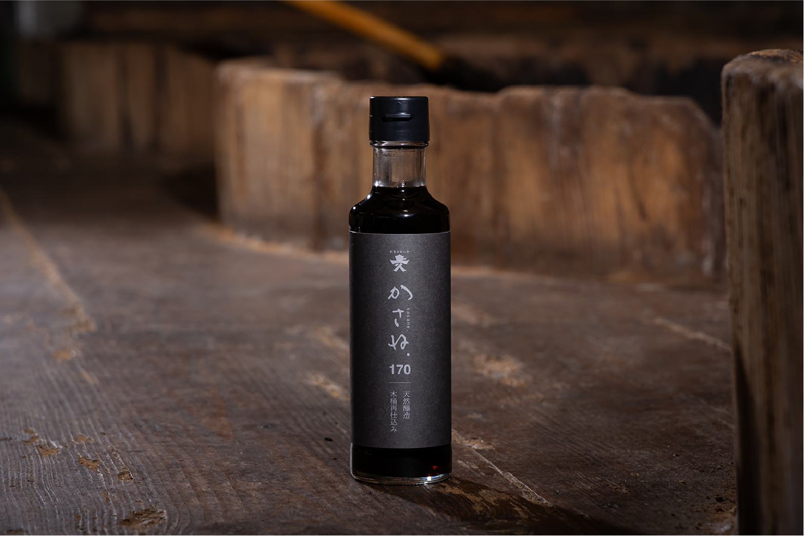 積み重ねてきた歴史と技術、そして蔵人の知恵と工夫。その歩みの先に生まれたのが、さいしこみしょうゆ「かさね.170」です。さいしこみしょうゆとは、仕込みの段階で生揚しょうゆを加え、再び醸造する製法でつくられるしょうゆのこと。二重にしょうゆを仕込むこの技法の“味をかさねる”という意味、未来へ技術と想いを受け継ぐ決意を込め「かさね」と名付けました。歴史をかさね、製法をかさね、想いをかさねて生まれた一本です。